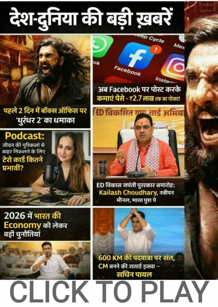 देश,दुनिया और राजस्थान की ख़बरें: धुरंधर 2 की धमाकेदार शुरुआत, अब FACEBOOK पर पोस्ट करने के मिलेंगे पैसे, CM भजन लाल का दावा हमारी सरकार किसान, युवा और महिलाओं के लिए तेजी से काम कर रही.. देखिये LATEST NEWS.. साथ ही देखिये जयपुर की ख़बरें सबसे पहले
