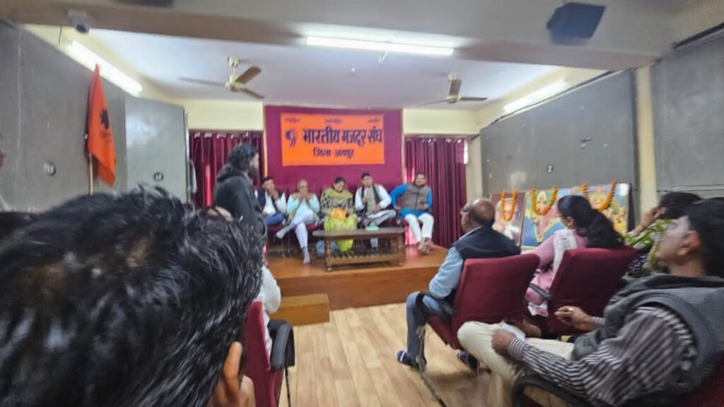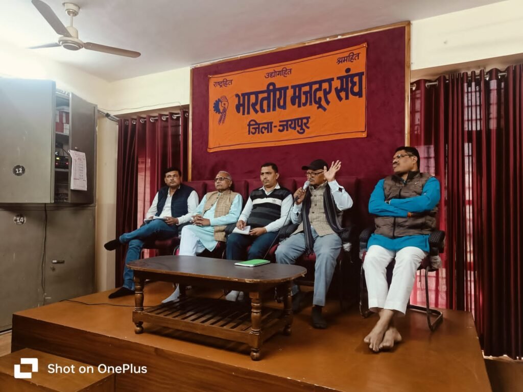 जयपुर। भारतीय मजदूर संघ, जयपुर जिला इकाई की बैठक संघ कार्यालय में आयोजित हुई, जिसकी अध्यक्षता जिला अध्यक्ष रंजीत गुर्जर ने की। बैठक में रैली संयोजक दिनानाथ रूथला, क्षेत्रीय संगठन मंत्री C.V. राजेश, अखिल भारतीय प्रभारी जयंतीलाल, प्रदेश महामंत्री हरिओम शर्मा और जिला मंत्री महेंद्र कुमार सहित विभिन्न यूनियनों के पदाधिकारी मौजूद रहे।