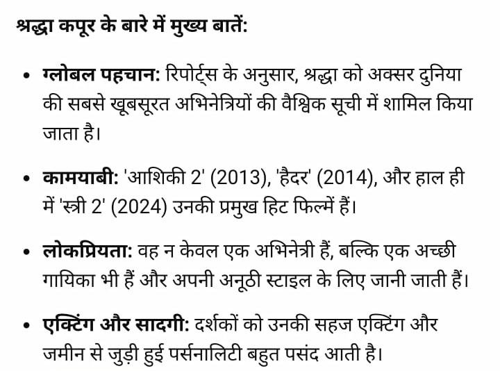 +5श्रद्धा कपूर वर्तमान में बॉलीवुड की सबसे लोकप्रिय और सफल अभिनेत्रियों में से एक हैं, जो अपनी सादगी और बेहतरीन अभिनय के लिए जानी जाती हैं। इंस्टाग्राम पर 94 मिलियन से अधिक फॉलोअर्स के साथ, वह सबसे अधिक फॉलो की जाने वाली भारतीय महिलाओं में से एक हैं। स्त्री 2 (2024) की सफलता ने उनकी लोकप्रियता को और बढ़ाया है।