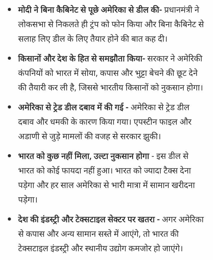 लोकसभा में विपक्ष के नेता राहुल गांधी ने मंगलवार को कहा कि प्रधानमंत्री मोदी ने अमेरिका से देश बेचने की डील की। उन पर एपस्टीन और अडाणी के केस का दबाव है। इस वजह से उन्होंने हिंदुस्तान और किसानों का डेटा अमेरिका को बेच दिया।
