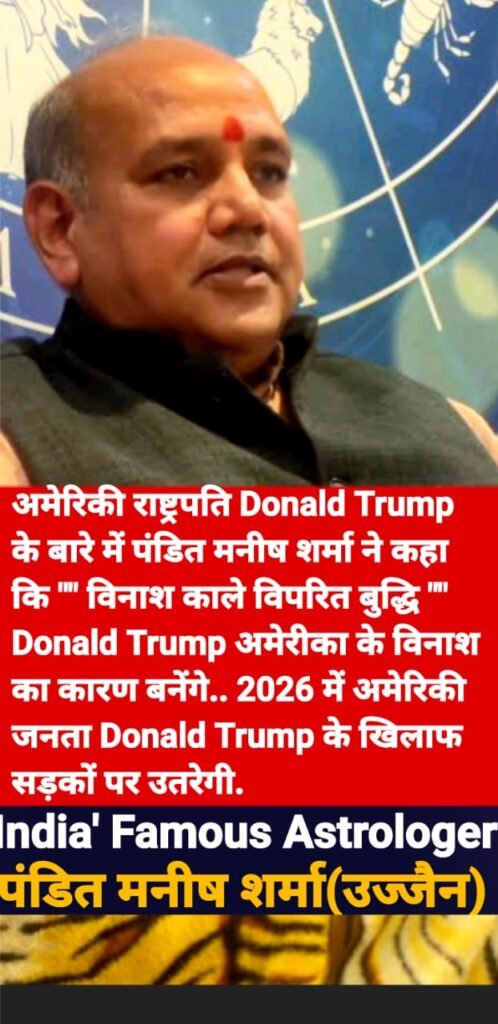 अमेरिकी राष्ट्रपति Donald Trump के बारे में पंडित मनीष शर्मा ने कहा कि “” विनाश काले विपरित बुद्धि “” Donald Trump अमेरीका के विनाश का कारण बनेंगे.. 2026 में अमेरिकी जनता Donald Trump के खिलाफ सड़कों पर उतरेगी.