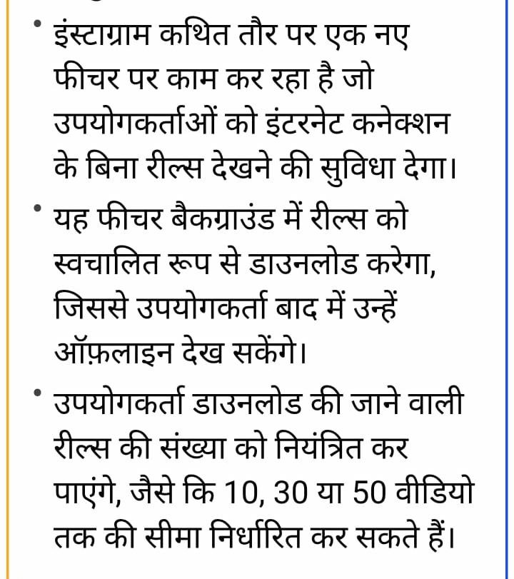 कैसे काम करेगा नया सिस्टमबताया जा रहा है कि इस फीचर में रील्स अपने आप बैकग्राउंड में डाउनलोड हो जाएंगी. यानी यूजर्स को अलग से वीडियो सेव करने की जरूरत नहीं पड़ेगी. ऐप खुद ही आपके लिए कुछ रील्स पहले से डाउनलोड करके रख देगा, जिन्हें आप बाद में बिना इंटरनेट के देख सकेंगे.